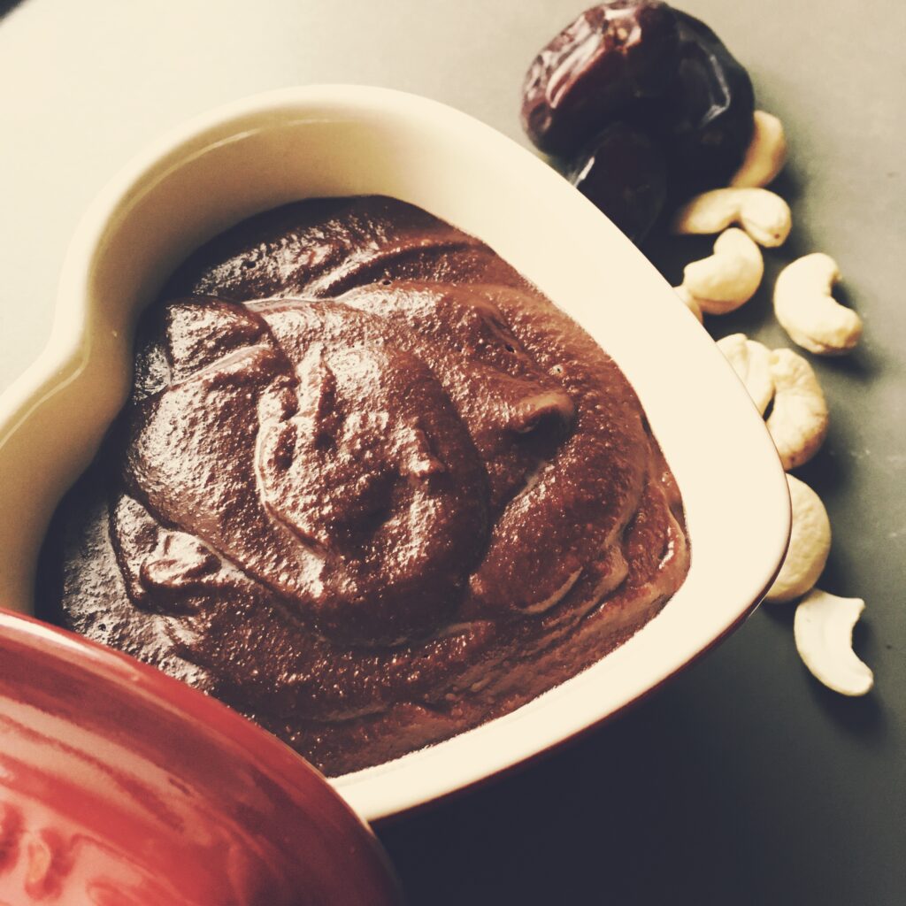 Mmmm. Det går faktisk an at blende nogle nødder og nogle hippieting og så ende op med en marzipanagtig dessert, jeg er vild med uden smør og chokolade! Mit første forsøg med at udvide dessertrepertoiret, så jeg også kan noget uden smør, mel, æg – og chokolade (!?) er gået så overraskende godt, at jeg straks må…