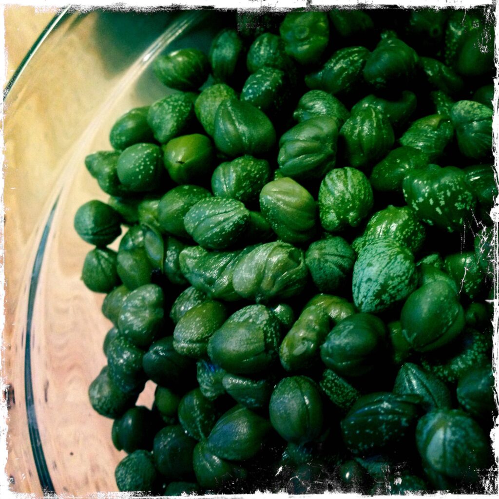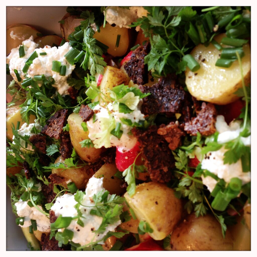 Simpelt er godt, og let er lækkert for køkkenfolket, når der er 50, der skal velsignes. Jordskokkerne skal bare vaskes og lægges hele i fade med salt, peber, olie og hele kviste timian. Bages i ovnen, til de stadig har bid. Blandes med gode oliven og kapers – hvis man er til det/orker at bøvle…