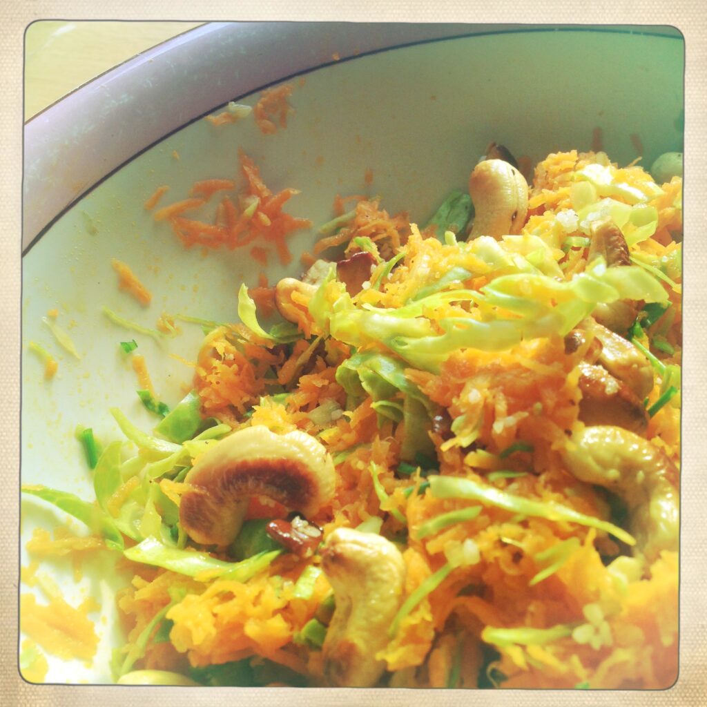 1/4 hvidkål 2 elstar æbler 1 appelsin 2 granatæbler Frisk koriander limesaft, fiskesauce, revet ingefær, hvidløg, finthakket citrongræs, chili Dette var ment som opfindelsen til at akkompagnere bok choi retten med mango. Og det var den faktisk ret så skøn til – indtil jeg glædestrålende udmalede ingredienserne i detaljer for vegetaren. Fiskesauce? ….jamen ja –…