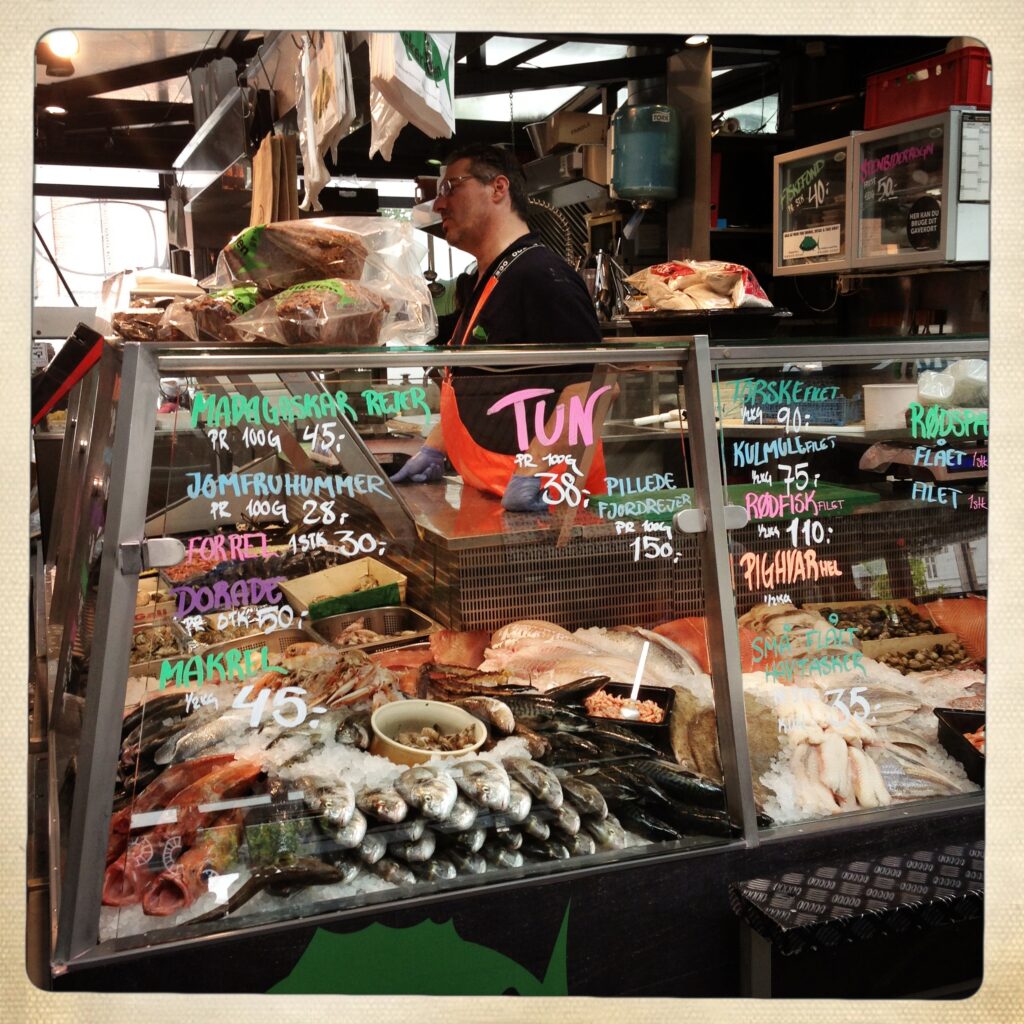 – eller bare melonsuppe og blækspruttesalat med fersknerDet er afskedsmiddagstider her i ghettoen. Idag stod den på yndlingsdamer. Udover at være yndlings er de også vegetarer. Men det er fest. Så jeg opgraderede dem til fisk- og skaldyrsspisere for en aften. Jeg endte med en tur i Torvehallerne for at se, hvad fiskemanden havde landet…