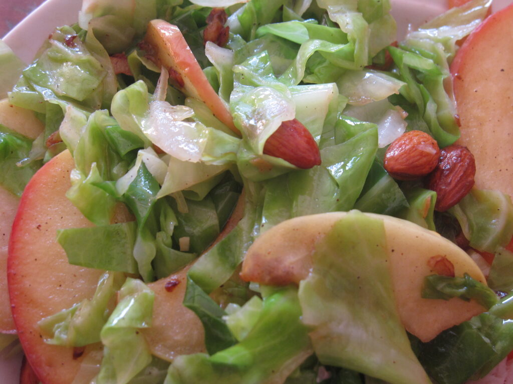 I min ferie på Skovvang kom jeg forbi en bod på vejen med de første Augustaæbler og spidskål – det blev til denne her ret, som er ret skøn og kan få mig til at spise kål. Blanchér snittet kål. Rist karry i lidt olie på panden med mandler og æblebåde. Vend kålen i når…