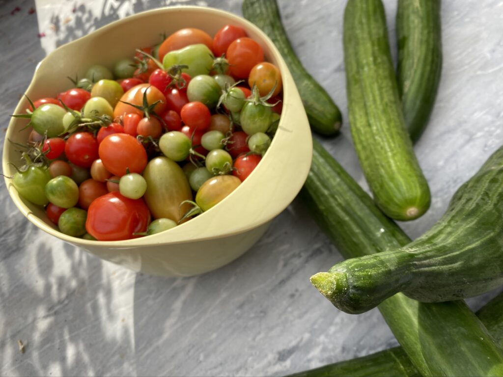 Aftensmad til 15 ud fra, hvad der var grøntsager tilovers, der skulle bruges, og hvad der kunne høstes på marken. Den begrænsning satte jeg for mig selv, da jeg mødte ind i køkkenet klokken 15. Idag virkede det genialt for kreativiteten og glæden at have den ramme at lege i, og ud af det kom…