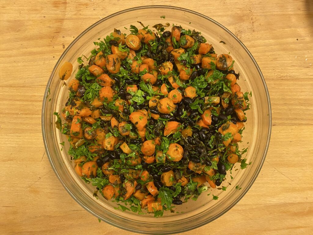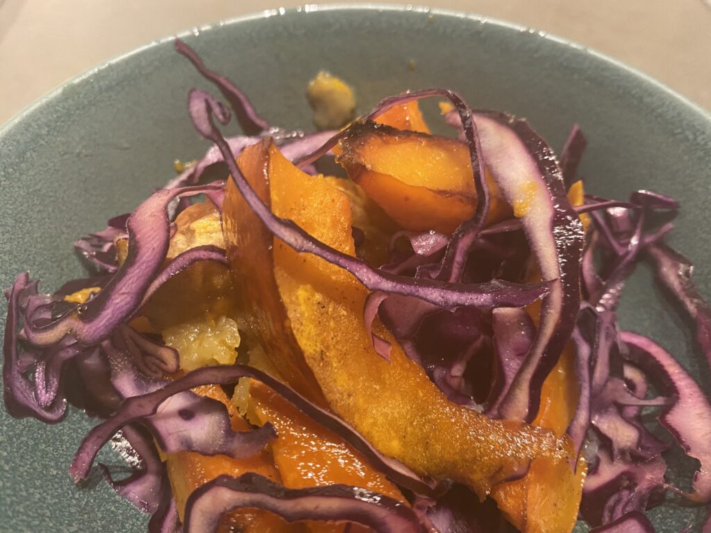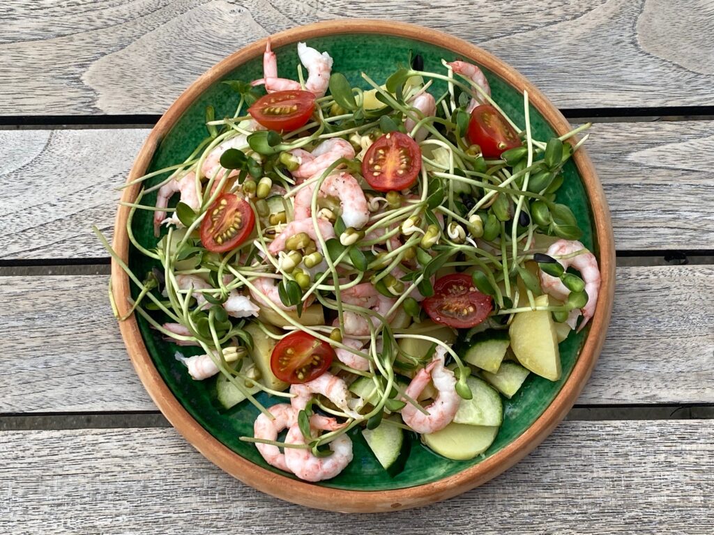 Denne salat er helt karakteristisk for, hvordan gode og nye ting opstår. Når man mindst venter det, og når det ikke gik som planlagt. Her var det en blanding af et madhold i stilhed – og så mig med intention om at slippe kontrollen og lade madholdet om at udføre den salat, der var mere…
