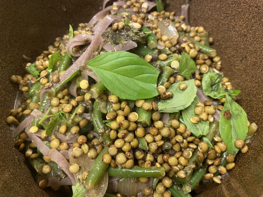 Denne ret var sådan en jeg fandt på som nummer 3 til aftenens bespisning ud fra, hvad der var på køl, frys og på marken i oktober. På lageret lå der stadig uanede mængder af de brune nudler, på frys var der grønne bønner, som brillerer ved at være forberedelsesfrie. Der stod også en enkelt…