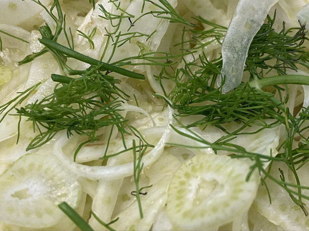 Der står en kasse med overskydende fennikler på køl, så jeg har lavet menu efter at få dem brugt. Fennikler er ret lækre, når de er helt tyndt skåret. Sammen med den bløde gedeost og den skarpe citrussmag bliver det en ret opgraderet grøn salat. Fenniklerne kan sagtens laves i god tid. Faktisk viste det…